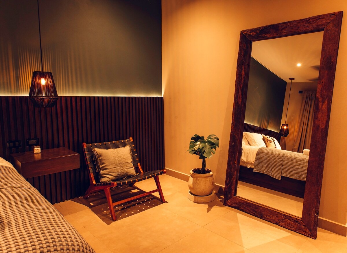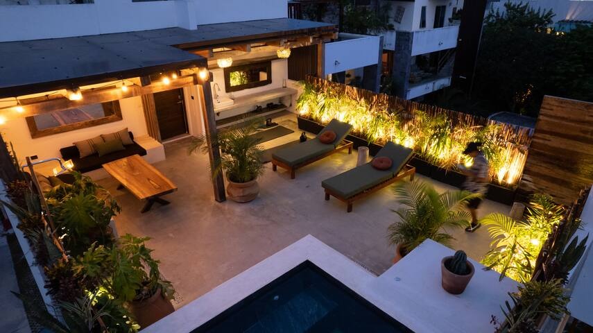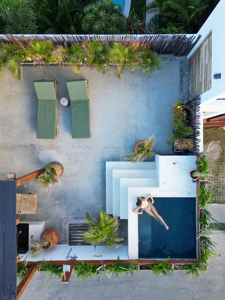 This property's unique dual-level design, with separate entrances for each floor, offers exceptional rental flexibility and maximizes your return on investment. The first level features a king bedroom with an ensuite bathroom, a second full bathroom, and an open-concept living area with a fully equipped kitchen that flows onto a spacious covered terrace. The second level acts as a private retreat, with another king bedroom, ensuite bathroom, and an expansive private rooftop terrace. This outdoor oasis, complete with a private plunge pool, daybeds, an outdoor shower, and workout equipment, is precisely what renters and future retirees desire in a Tulum home.